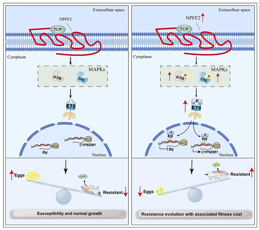本文采用杀虫剂生物测定和两性生命表,明确了烟粉虱对新烟碱类杀虫剂噻虫啉的抗性水平及其生殖力减弱的适合度代价;进一步通过Western Blot、免疫荧光、分子对接与动力学模拟、重组P450表达及UPLC-MS/MS分析,阐明了细胞色素P450酶CYP6EM1在噻虫啉抗性中的功能;此外,利用双荧光素酶实验、Phos-tag磷酸化分析、EMSA、酵母单杂交和免疫共沉淀实验,揭示了磷酸化激活后的蜕皮激素诱导蛋白75(E75)可以同时结合抗性P450基因CYP6EM1和生殖代价形成基因Bg上游启动子区域,导致烟粉虱抗性水平提升但伴随繁殖能力减弱的适合度代价;同时发现GPCR蛋白(NPFF2)通过激活MAPK(p38和ERK)信号通路,促进下游E75发生磷酸化;从而阐明该GPCR-MAPK-E75调控轴发挥着双重转录调控功能:一方面正向激活P450解毒基因CYP6EM1的表达,另一方面负向抑制卵子发生关键基因Bg的转录。