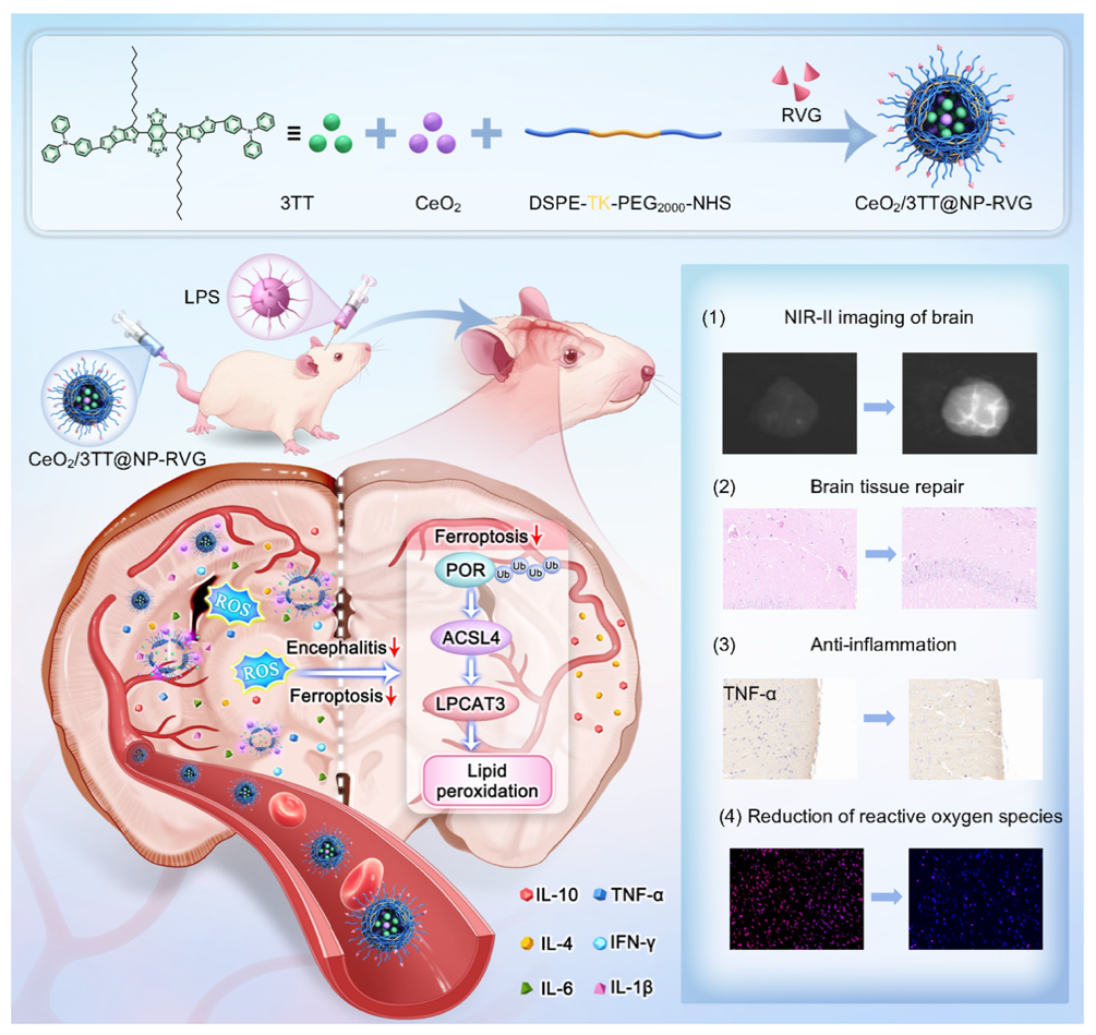 脑炎是一种危及生命的神经系统疾病,具有高死亡率和严重的长期神经后遗症。目前,由于缺乏针对潜在病理机制的有效治疗手段,加之血脑屏障(BBB)的阻碍,现有临床干预多局限于症状缓解,难以有效抑制铁死亡及活性氧(ROS)介导的神经毒性。
