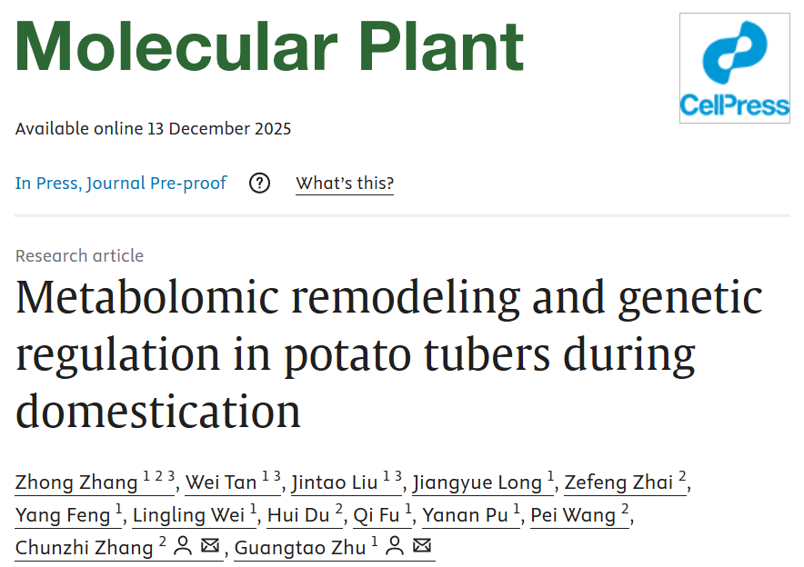 近日,中国农业科学院深圳农业基因组研究所(岭南现代农业科学与技术广东省实验室深圳分中心)张春芝课题组联合云南师范大学在《分子植物(Molecular Plant)》上发表题为“Metabolomic remodeling and genetic regulation in potato tubers during domestication”的研究论文。该研究通过多组学技术系统解析了马铃薯块茎从野生祖先到栽培地方品种的代谢重塑过程及遗传调控机制,为培育风味更佳、营养更丰富的马铃薯新品种提供了关键理论支撑和基因资源。