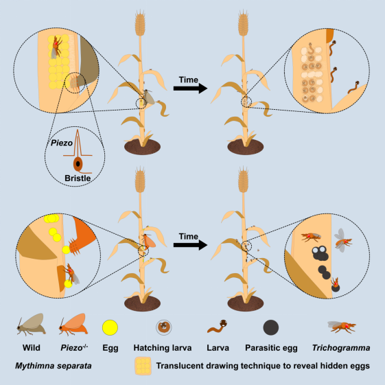 近日,中国农业科学院深圳农业基因组研究所(岭南现代农业科学与技术广东省实验室深圳分中心)王桂荣课题组在《细胞报告(Cell Reports)》上发表题为“Piezo mediates oviposition in shielding gaps to protect moth eggs from parasitoid wasp”的研究论文。该研究揭示了东方粘虫雌蛾通过触觉选择安全产卵位置的生存策略。研究发现,东方粘虫偏好产卵于狭窄缝隙(如叶鞘或人工纸缝),这种狭缝产卵方式能有效防止赤眼蜂寄生虫卵。而寻找狭缝作为产卵地的关键在于雌蛾产卵器上的鬃毛——它们能通过压电蛋白Piezo感知机械压力来判断缝隙大小,当鬃毛或Piezo受损时,雌蛾会随机产卵,导致虫卵易被赤眼蜂寄生。