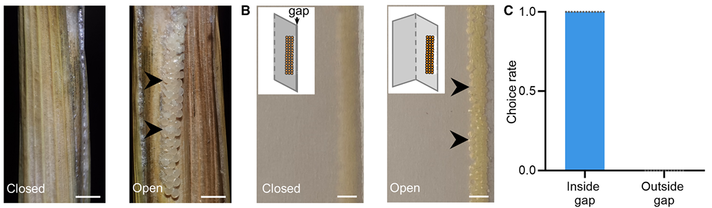 王桂荣团队模拟了不同的产卵环境,以观察和分析雌蛾的行为反应。研究人员用折叠纸缝模拟了雌蛾的产卵环境,发现雌蛾几乎把所有卵都产在缝隙里。研究人员进一步创新性地用刚性材料制作了11种宽度(0.1–1.1毫米)的缝隙,发现雌蛾尤其偏爱0.5毫米的窄缝,而极窄或宽的缝隙均被回避。将虫卵置于赤眼蜂的环境下,结果显示,纸缝内封闭的卵存活率超95%,而揭开纸缝暴露的卵95%以上被寄生。