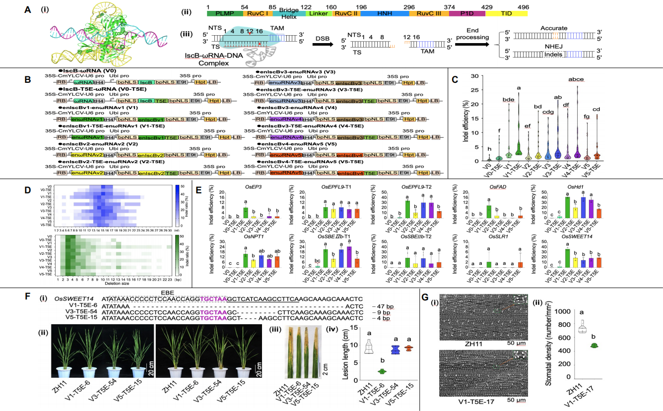研究团队对IscB蛋白及其引导RNA进行了多重工程化优化组合,并创新性地将T5核酸外切酶融合,构建出高效的enIscB-T5E-enωRNA植物基因编辑系统。实验结果表明,该系统在水稻细胞及稳定株系中均表现出良好的编辑活性,在稳定遗传株系中最高编辑效率达41.87%。同时,研究人员利用该编辑系统,成功实现了对水稻抗白叶枯病、抗旱等关键基因的靶向编辑。结果显示,相关基因编辑株系分别表现出显著增强的白叶枯病抗性和抗旱特征。该系统的构建和优化,为作物基因功能解析和精准遗传改良提供了重要工具和技术支撑。