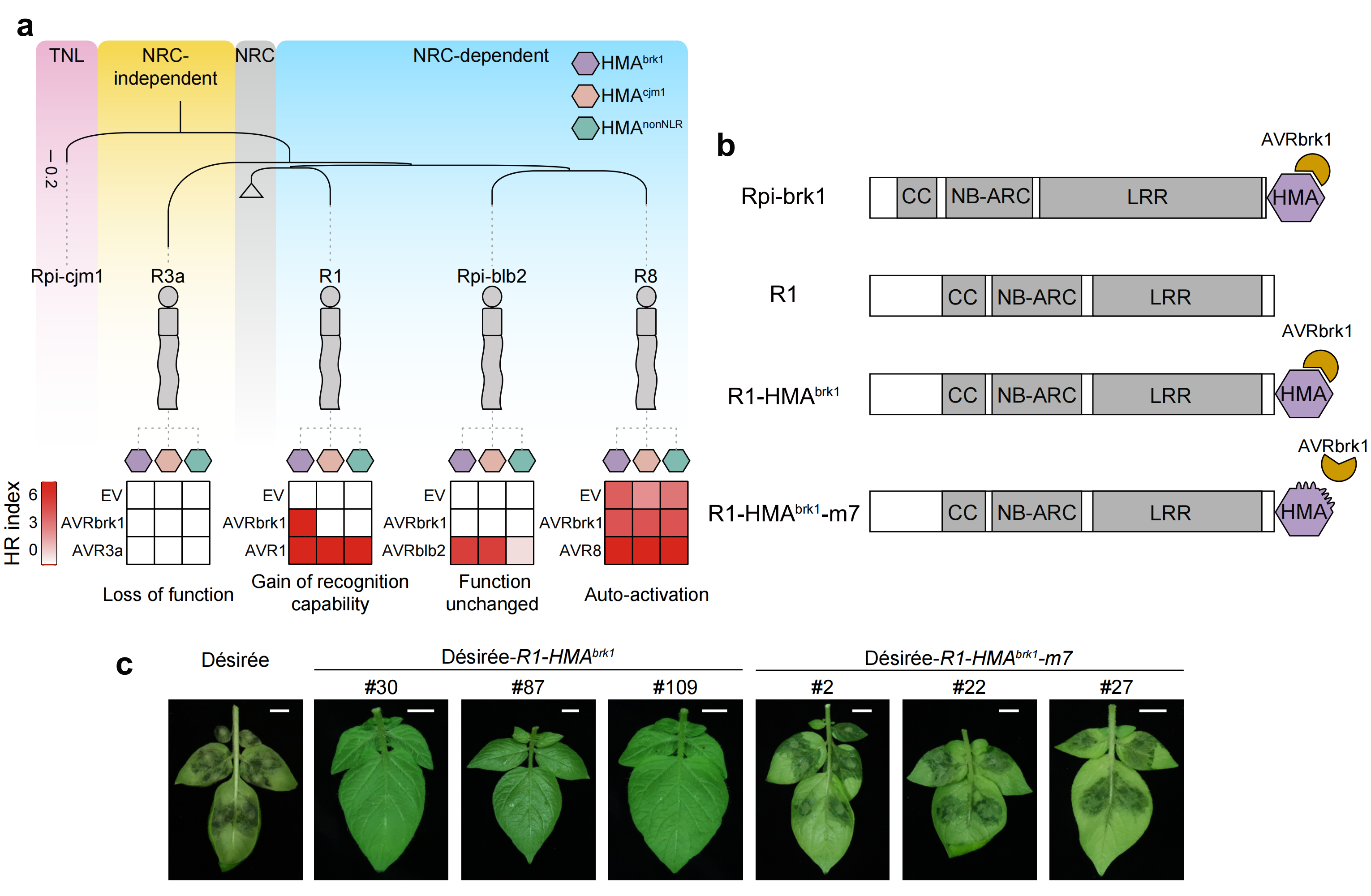 更为令人振奋的是,研究团队发现将Rpi-brk1的HMA结构域“嫁接”到已失效的抗晚疫病蛋白R1的末端后,可使原本仅识别AVR1的R1同时识别AVRbrk1,从而拓展了抗病谱(图2)。这种“即插即用”的基因设计思路为快速培育广谱抗病品种提供了全新思路。研究团队将其命名为“结构域插件”(plug-in)育种策略。研究表明,将R1的LRR结构域末端添加Rpi-brk1的HMA结构域,能使R1获得对AVRbrk1的识别能力。这一策略后续可通过基因编辑手段,将特定功能域精准嵌入作物原有抗病基因,实现广谱抗性的创制。