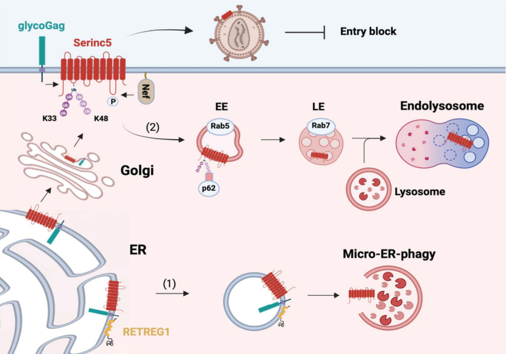 该研究发现,位于细胞膜的Nef蛋白在p62的帮助下,通过内体-溶酶体通路降解细胞膜上的SERINC5,且这一过程需要SERINC5的泛素化和磷酸化修饰。glycoGag蛋白主要定位在内质网中,它不仅通过泛素-溶酶体通路降解细胞膜上的SERINC5,还能在SERINC5未转运到细胞膜之前,通过内质网自噬受体RETREG1介导的微自噬-溶酶体通路对细胞浆中的SERINC5进行降解,且这一过程不依赖SERINC5的泛素化和磷酸化修饰。研究成果揭示了不同病毒蛋白拮抗宿主限制因子SERINC5的差异性分子机制,为开发靶向病毒入侵的新型抗病毒疗法提供了理论依据。