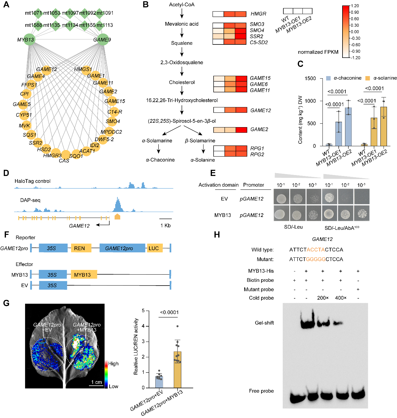 图4|MYB13介导GAME12调控SGA合成的分子机制