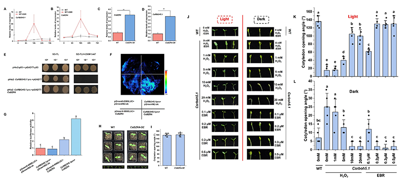 近日,中国农业科学院蔬菜花卉研究所设施栽培课题组在过氧化氢(H2O2)调控黄瓜子叶开闭以及生长的机制研究方面取得新进展,揭示了CsBZR4-CsRBOH5.1-BR模块调控黄瓜子叶的开闭和扩张。相关成果以“CsBZR4-CsRBOH5.1-BR module regulates opening/closure and expansion of cucumber cotyledons” 为题发表在国际期刊International Journal of Biological Macromolecules(IF=8.5)上。
