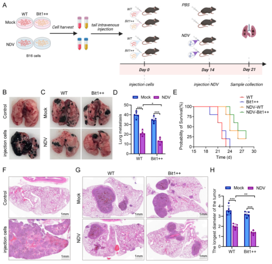 本研究发现,新城疫病毒(NDV)感染可触发肿瘤细胞死亡,并伴随失巢凋亡关键调控因子 Bit1(Bcl-2 转录抑制因子 1)由线粒体向胞质的转位。体内实验进一步证实,NDV 显著抑制小鼠黑色素瘤的生长与转移,而 Bit1 过表达则增强该效应。该研究首次阐明 NDV 通过调控 Bit1 诱导肿瘤细胞失巢凋亡、进而阻断肿瘤转移的新机制,为深入理解溶瘤病毒介导的肿瘤细胞死亡提供了新视角,并鉴定出溶瘤病毒新的潜在作用靶点。