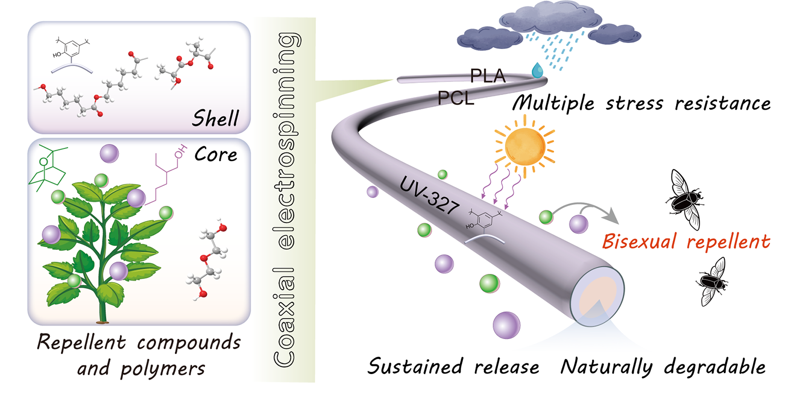 近日,植保所经济作物虫害监测与控制创新团队在《Chemical Engineering Journal》(IF=13.2)上在线发表题为“Integrated UV-protective, water-resistant, and biodegradable core-shell micro/nanofiber mats enabling controlled repellent delivery for sustained pest management”的研究论文。该研究开发了负载华北大黑鳃金龟(Holotrichia oblita)驱避剂的核壳结构微纳纤维膜缓释载体,将其与农用地膜组合使用后形成了兼具“物理阻隔与化学驱避”为一体的金龟子防控技术,为农业害虫绿色防治提供了一种兼具高效性、环境友好性与可持续性的新型解决方案。