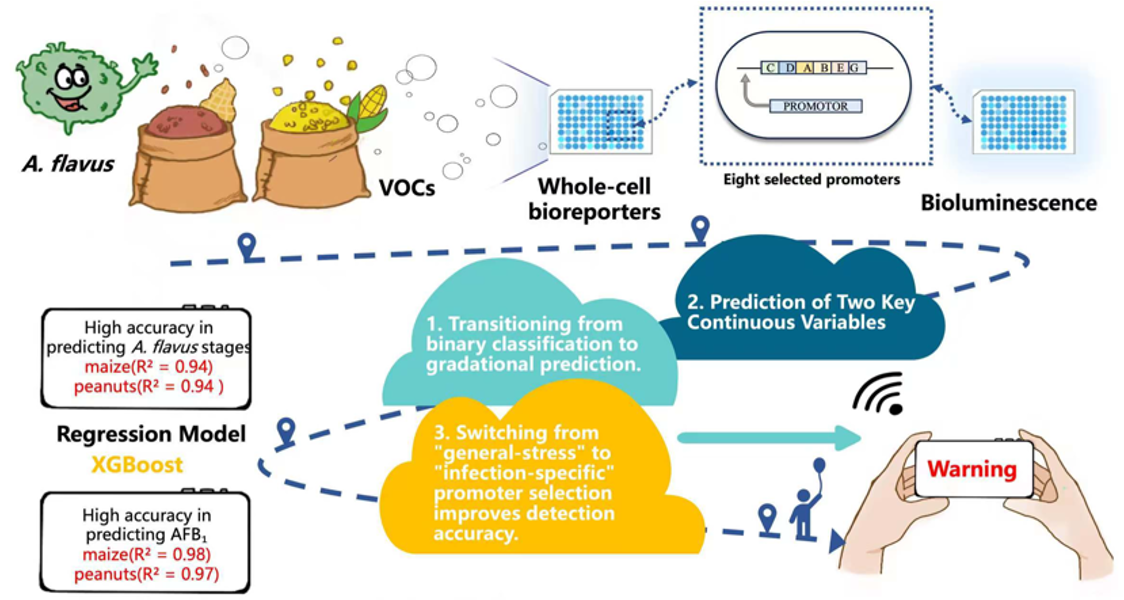 该研究针对黄曲霉侵染玉米、花生后产生的特征性有机挥发物,采用转录组学方法筛选到8个全新的特异性诱导表达基因,应用其启动子序列构建了8个大肠杆菌发光菌株,组成全新的全细胞生物传感器阵列。该阵列结合包括随机森林(Random Forest)、XGBoost、CatBoost、随机梯度提升(SGB)、支持向量机(SVM)以及稀疏偏最小二乘判别分析(SPLSDA)等多种人工智能机器学习回归模型,实现了对玉米和花生霉变天数及AFB1含量的精准定量预测。其中,XGBoost作为一种基于梯度提升框架的高性能集成学习算法,在众多模型中表现尤为突出。在玉米的内部验证中,XGBoost模型对霉变天数与AFB1含量的预测准确率分别达到94%和98%,并在采用独立黄曲霉菌株的外部验证中保持了强大的泛化能力,显著优于此前基于通用应激启动子的全细胞传感器。在花生中亦取得类似结果,XGBoost在内部验证中对霉变程度和AFB1含量的预测准确率分别达到94%和97%,证实了该模型在不同基质和真菌菌株中的稳健性。特征重要性分析进一步揭示了早期宿主响应机制。