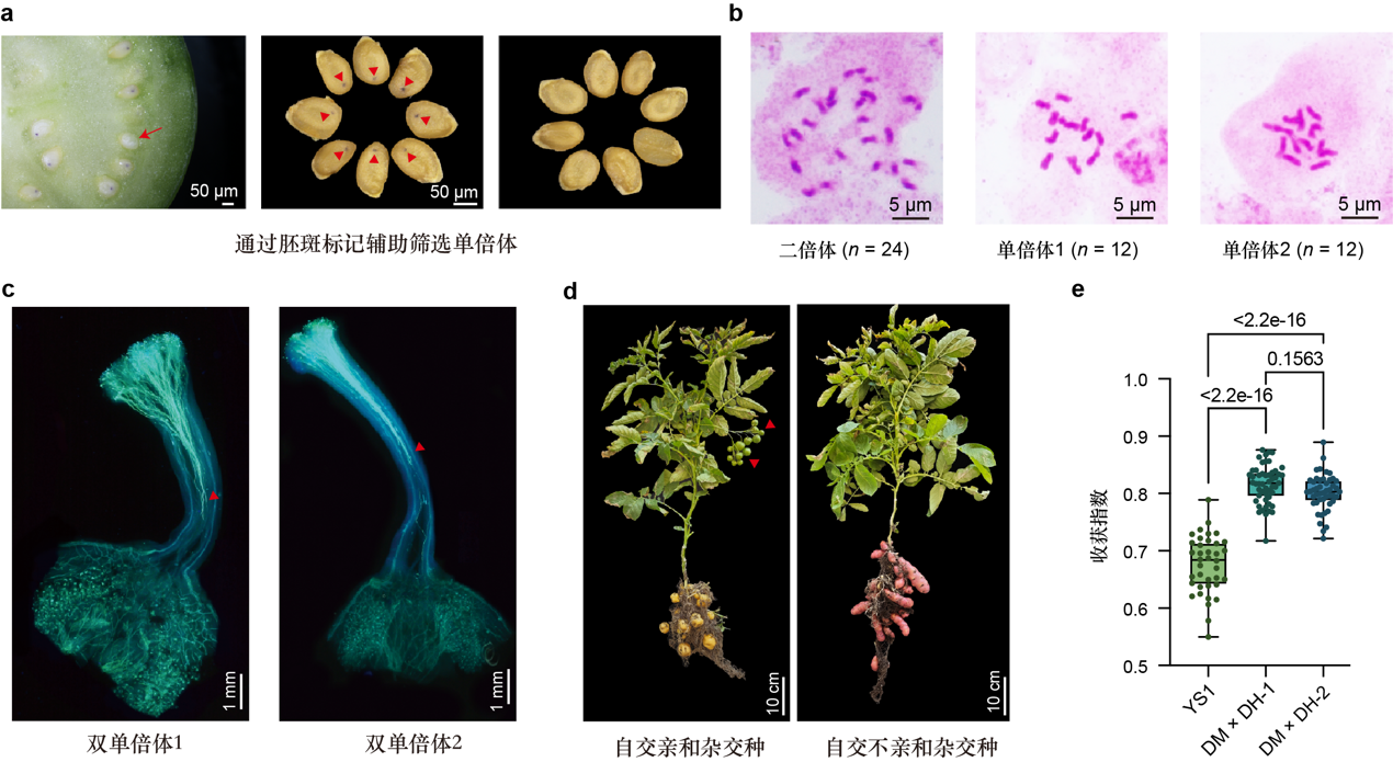 针对上述问题,研究团队提出了一种通过单倍体育种快速培育自交不亲和二倍体纯系和杂交种的策略。马铃薯基因组中含有大量有害突变,直接诱导获得的单倍体难以存活,因此需要先淘汰大效应有害突变之后再进行单倍体诱导。研究人员利用单倍体诱导系PL-4与不含大效应有害突变的杂合二倍体材料YS1杂交,通过高效的筛选体系,从7000多粒无胚斑种子中筛选到700多个单倍体后代,并鉴定出不携带自交亲和基因的单倍体植株(图1a, b)。随后,对单倍体进行秋水仙素处理,获得了生长势强、花粉活性恢复正常、但表现为自交不亲和的双单倍体株系(图1c)。利用这些株系作为父本,与双单倍体材料DM进行杂交,获得了两组F1杂交组合。由于双亲都是自交不亲和的,杂交时无需人工去雄,不仅降低了制种成本,也有效保证了杂交种的纯度。田间试验结果表明,这两组杂交组合均表现出显著的杂种优势,且由于恢复了自交不亲和性,植株无天然结实,能够将更多的光合产物分配给地下块茎(图1d)。与自交亲和的杂交种相比,自交不亲和杂交种的收获指数提高了10%(图1e)。
